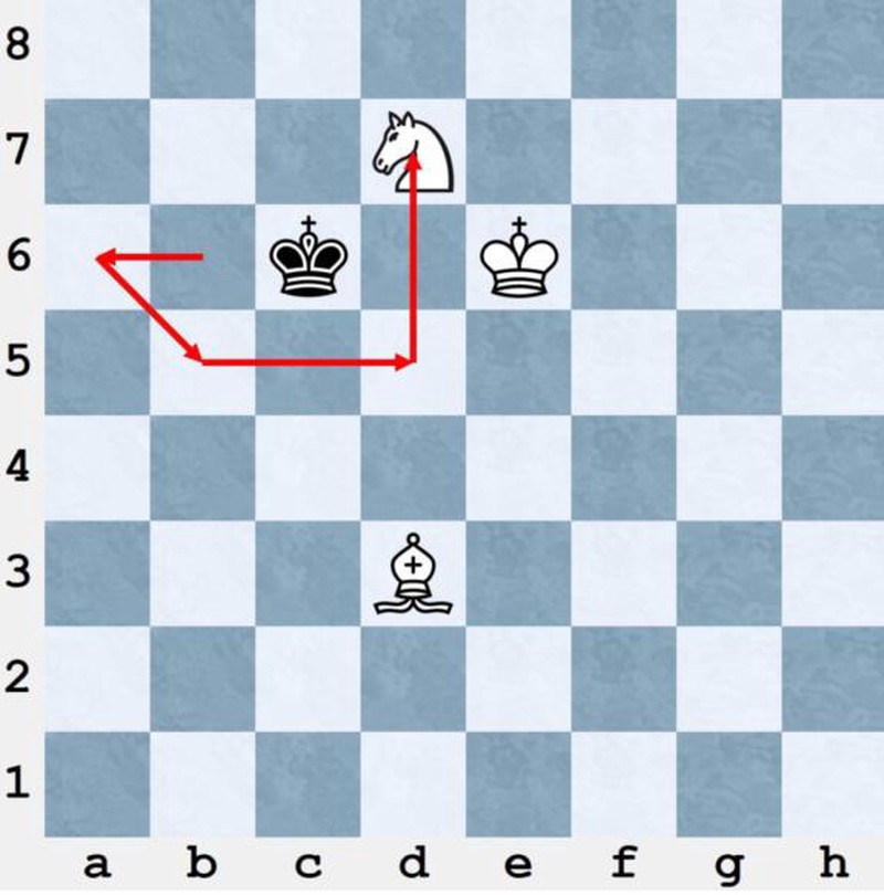 And there we have it. The king and bishop are beside each other. We need now only to get the knight to be able to control b8 and the bishop to control a8.