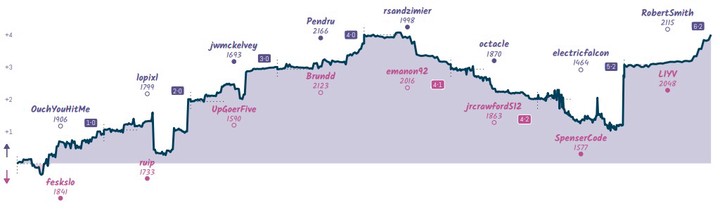 Whatever your strengths, pairing logic will find a way to act funny: Another perpetual guest in our leaderboard Top 20 is @pulsar512b - here recurringly since Week 5, though not quite consistent enough to approach the Top 10 (yet?). pulsar is notable for a very respectable 7-11 in matchups as the rating underdog... alas, pairing logic didn’t play to her strengths and delivered a mix of very much higher rated opponents, or slightly lower ones. pulsar still collected a bunch of points and just a few days ago clinched ascension to Level 8. Which means that pairing logic will dial up opponent strength a (small) notch - let’s see what that means starting next week.