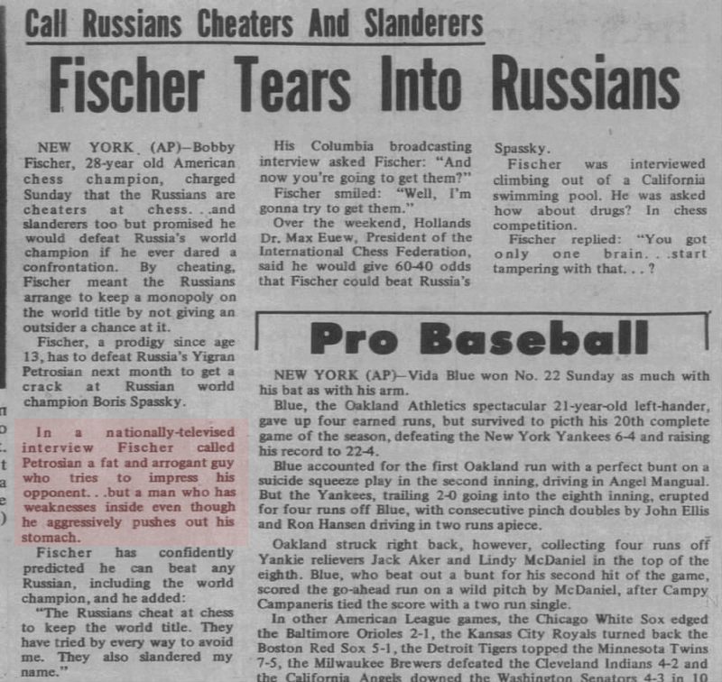 Bobby Fischer - August 17, 1971. Credit: Newspaper.com (Clipping), bobby-fischer-1971.blogspot.com (Index of Clippings)