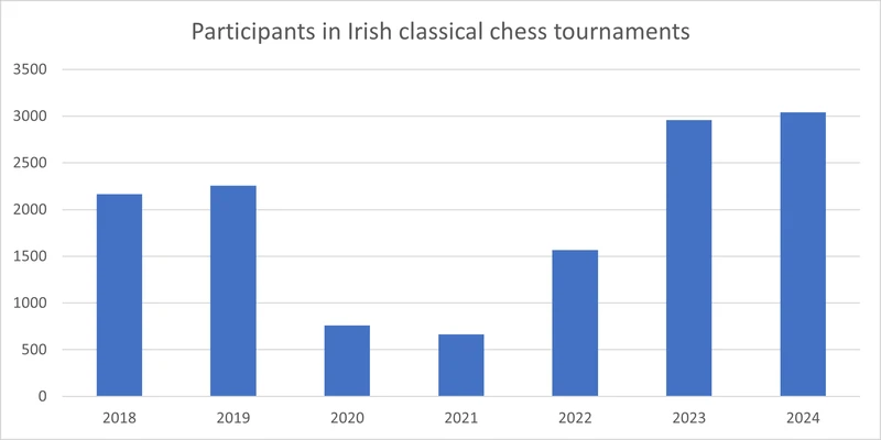 Growth was especially strong for rapid and blitz tournamentsLast year I wrote a blog asking if the boom in online chess had been converted into growth in over-the-board chess. By looking at the tournaments in Ireland, I found that there were 50% more participants in chess tournaments in 2023 than in 2019. But did this growth continue in 2024?