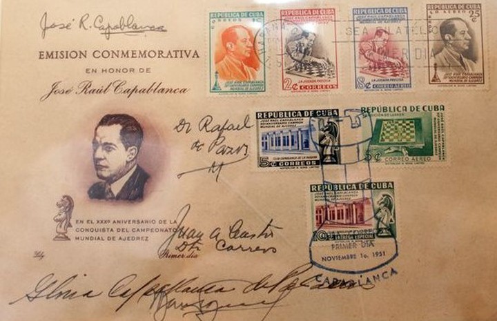 Последовавшая несколько позже (в 1951-м) серия кубинских марок, посвященных третьему чемпиону мира по шахматам Хосе Раулю Капабланке, также представлена в коллекции Анатолия Карпова. Причем не только марками, но и памятным конвертом.