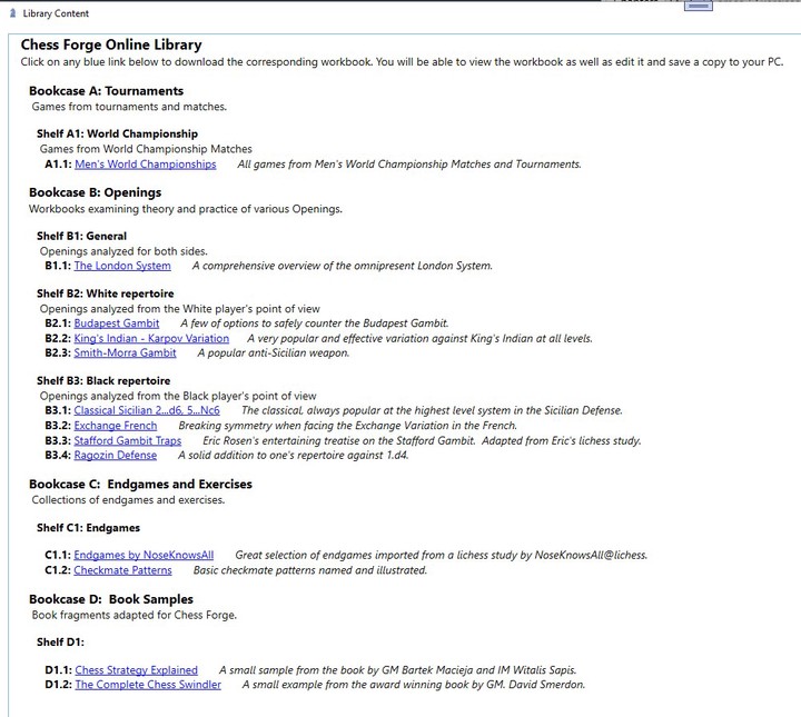 Click on any book (or "workbook" in Chess Forge's terminology) to open it in the program. You can view and edit it just as you would with a workbook loaded from your PC. You can also save your own copy locally, if you wish.