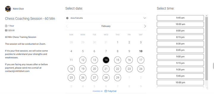 You can now schedule a chess coaching session with me from here - https://tidycal.com/nikhildixit