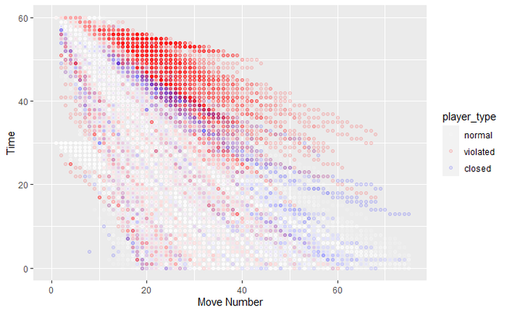 Now we should see how the players manage their time differently. The white dots are moves made by normal players. Red and Blue were made by violated/closed players. We can already see how winning on time happens often in these players. Most of the red and blue dots are populated upper-right side compared to the white dots.