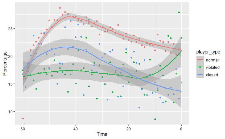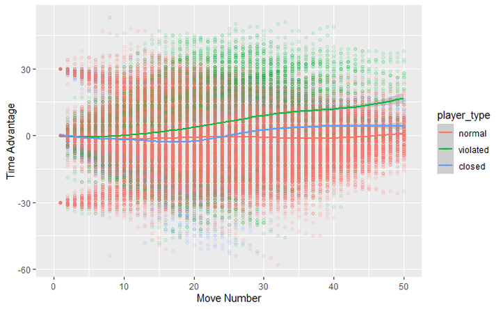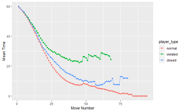 If you want a simpler graph showing the mean time left by the move number, this graph will do. Violated players on average have 20 seconds left even after 60 moves.