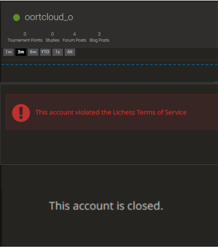 Lichess has its profile for each player. For instance, my profile looks like the one below. I have not violated the terms of service nor closed my account. However, if you violate the Terms of Service, you get the red mark with the text "This account violated the Lichess Terms of Service." If you decide to close the account, no profile will appear, and it will just say, "This account is closed."