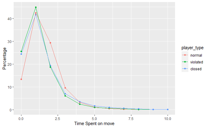 The following are the proportions of Time spent making moves for each type of player. This may look similar but they are largely different. The proportions of 0 seconds spent are 10% lower in normal players and the moves that spent 2 seconds are 10% higher in normal players.