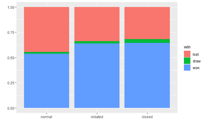 Among these wins and losses, we can try to differentiate how they won or lost. As expected, violated or closed accounts have very low proportions of loss on time. Most likely this means they have no time management issues. As expected, they have a lot of wins from checkmate or opponents' resignations. Normal players have more wins on time but violated/closed players have much higher normal wins.