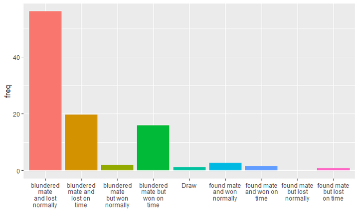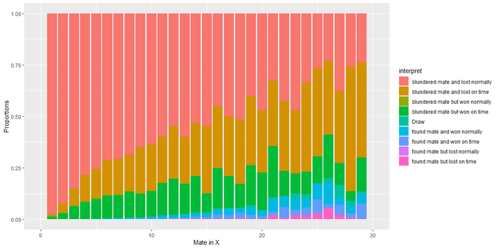 The graph might be hard to interpret but it is a distribution of categories given a mate in X. For instance, given mate in 1, most games classify as "blundered mate and lost normally". So most lichess bullet players have a good time punishing other players for blundering mate in 1. However, as X grows, the proportion of "blundered mate and lost normally" diminishes. The proportion of "blundered mate but won on time" starts to grow up.