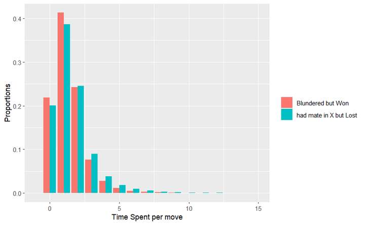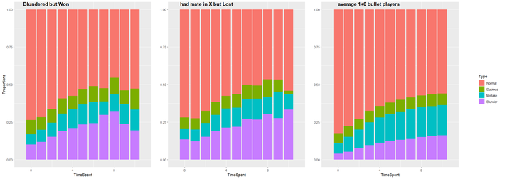 This is the type of move given the time spent on the move. For instance, given 0 time spent on the move for players who blundered but won, 75% were normal moves. We can see that the proportion of normal moves is higher with lower Time spending. This may be due to opening and some obvious, non-losing safe moves. The proportion of normal moves is generally lower in both of our subjects of study. This may be due to the complicated middle game in which mate in X happens. Probably there are a lot more moves the engine would say is a "mistake" or "blunder".