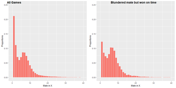 The below graph shows the distribution of mate in X distribution and the mate in X that happened in the games where a player blundered mate but won on time. We can see a clear difference. The proportion of mate in 1 and 2 drops significantly. The statistics for each distribution are as follows: