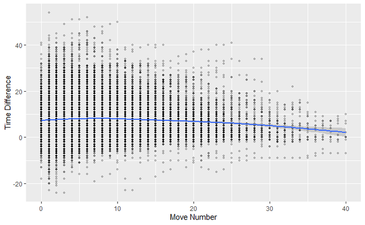 The Time difference continued after the blunder happened. We would assume the side that blundered would take more time to come back into the game but the lead in time doesn't seem to evaporate.
