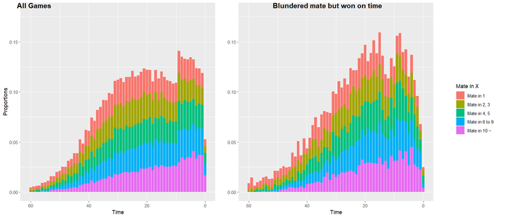 We can see that most blundered mates will result in losing normally or on time. This account for more than 70% of the games including a "mate in X". However, there is a significant amount of games where a side blundered mate but won on time. This will be the focus of today's post.