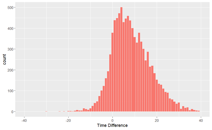 We should also dig deeper into the time management differences between the two players. Below is the distribution of the Time difference (player who won - player who lost) when the mate in X blunder happened. On average, the blundered side was 8 seconds ahead on the clock when they blundered.