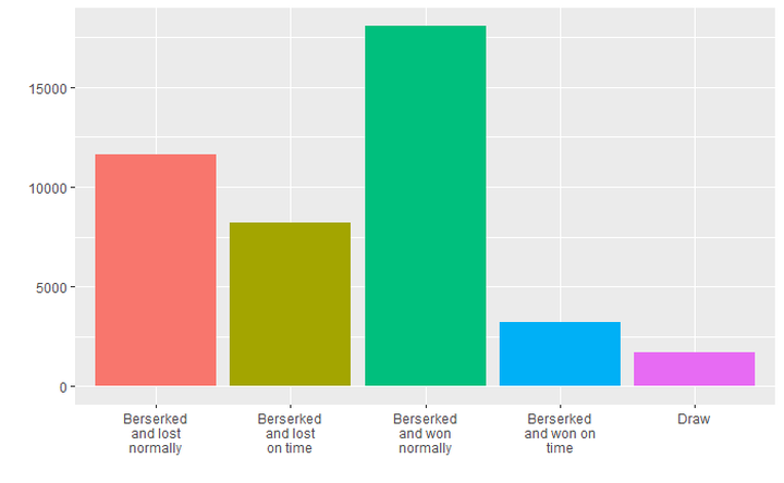 The following is the distribution of how games end given one side berserk. Winning or losing normally (this includes checkmate + resignation) was the most likely result. A draw was the least likely result of a berserk-involved game.