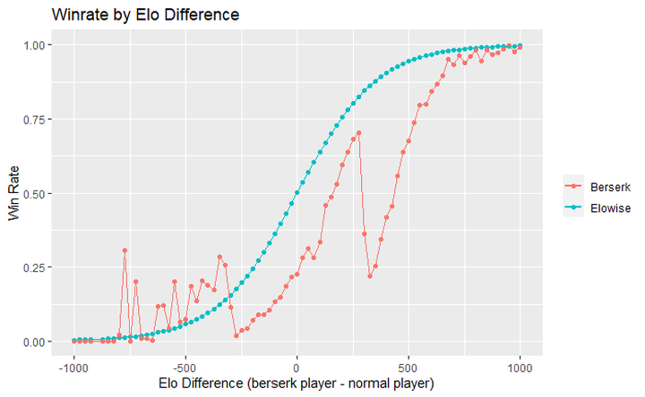 When you berserk in the arena tournament, you gain +1 point for either a win or a draw. So, we can calculate the expected points you can get given some elo difference. You might think that the -500 mark might be good to berserk but the sample size was low on this part. The safest berserk window is probably when you are +500 Elo from the opponent (This might not happen that often).