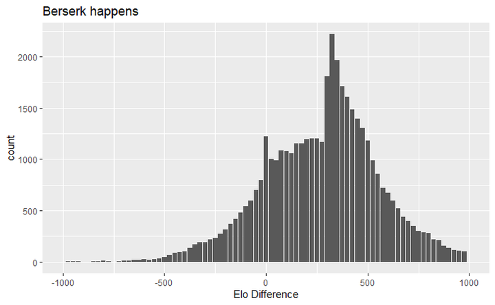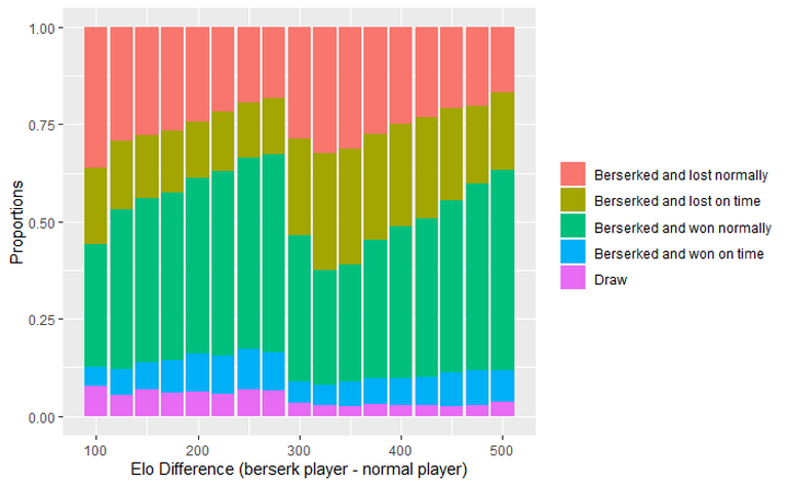 Furthermore, from the distribution of categories, we can see that the amount of "berserker and lost on time" increase by a lot in that certain elo range and the "normal wins" significantly decrease.