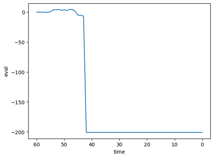 The following would be a sample graph of eval by time. The evaluation was recorded at each time of the game. Black checkmated white when the player had 40ish seconds left. After that, the values were replaced with the minimum value of the dataset.