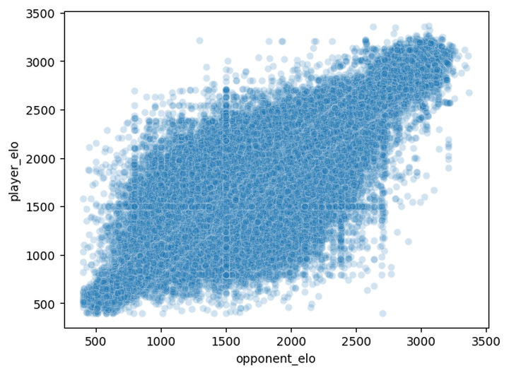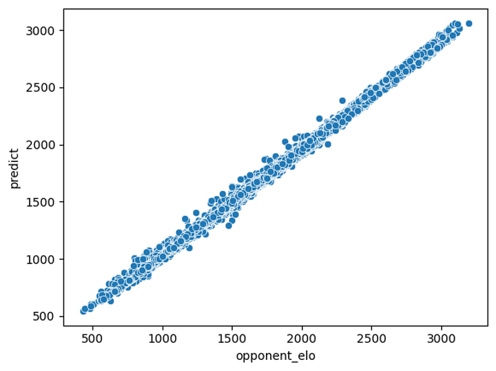 However, the models seemed to significantly rely on the opponent elo information. The training set had the following distribution of opponent\_elo and player\_elo. There is a trend of player\_elo and opponent\_elo being similar due to matchmaking but there were cases of elo difference being large which was completely neglected by the ML model (This may be due to the squared error loss).