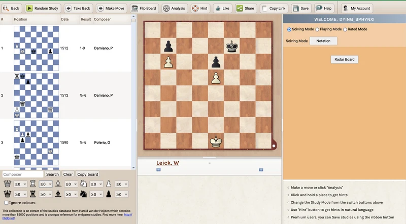 ChessBase offers a free online portal called ChessBase Studies. It contains over 8,000 studies that can be filtered by material and includes helpful hints. While the platform awards points to users for solving studies, it doesn't rate the difficulty of the studies themselves. Though I initially found it promising, the confusing user interface (typical of ChessBase products) and lack of difficulty ratings made me lose interest. Still, it's a valuable resource if you're not concerned about study difficulty levels.