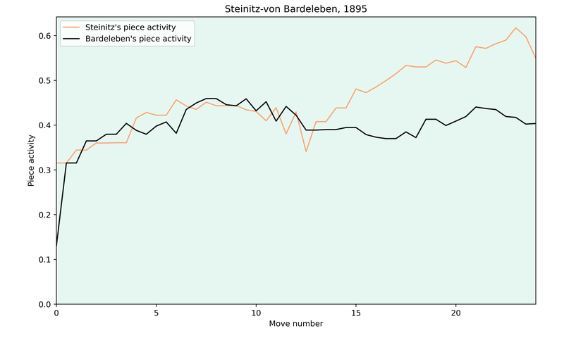 The activity for white fluctuates as the exchanges occur, but I think the main reason is that Steinitz exchanges his active pieces and then uses the next move to activate one of his remaining pieces. Overall, the activity on move 10 before the exchanges is similar to the activity on move 14, after the pieces were exchanged.
